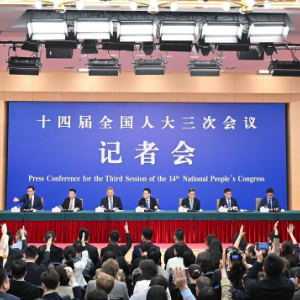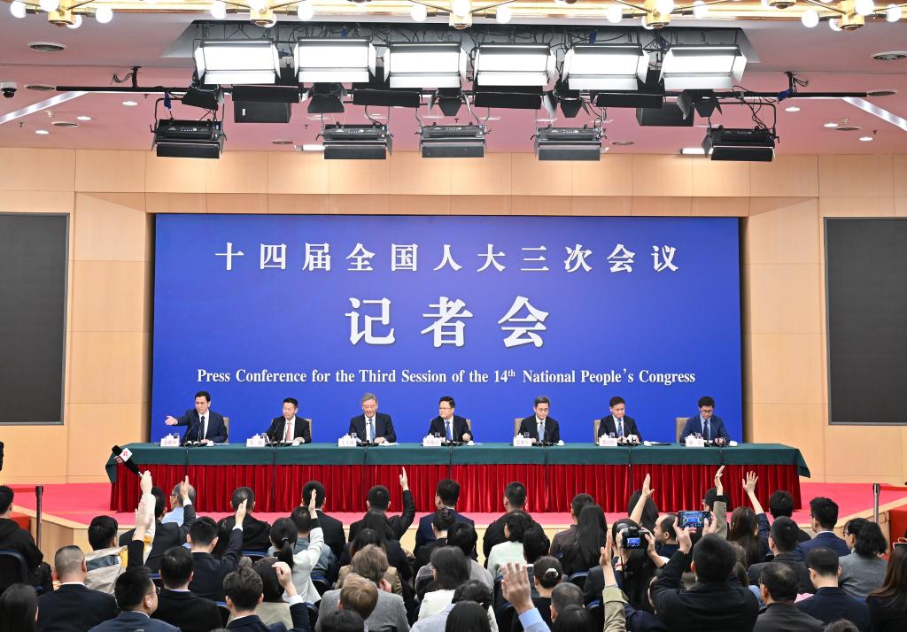 3月6日,十四届全国人大三次会议在北京梅地亚中心新闻发布厅举行记者会。国家发展和改革委员会主任郑栅洁、财政部部长蓝佛安、商务部部长王文涛、中国人民银行行长潘功胜、中国证券监督管理委员会主席吴清就发展改革、财政预算、商务、金融证券等相关问题回答中外记者提问。