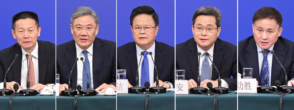 3月6日,十四届全国人大三次会议在北京梅地亚中心新闻发布厅举行记者会。国家发展和改革委员会主任郑栅洁(中)、财政部部长蓝佛安(右二)、商务部部长王文涛(左二)、中国人民银行行长潘功胜(右一)、中国证券监督管理委员会主席吴清(左一)就发展改革、财政预算、商务、金融证券等相关问题回答中外记者提问(拼版照片)。