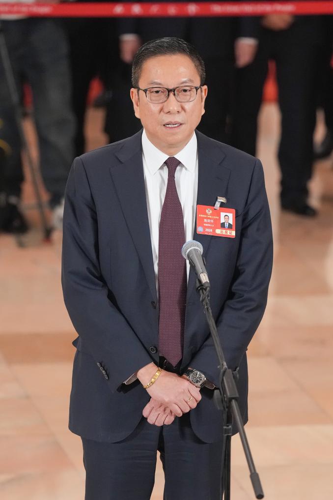 3月10日,全国政协十四届三次会议第三场“委员通道”集体采访活动在北京人民大会堂举行。这是全国政协委员施荣怀接受媒体采访。