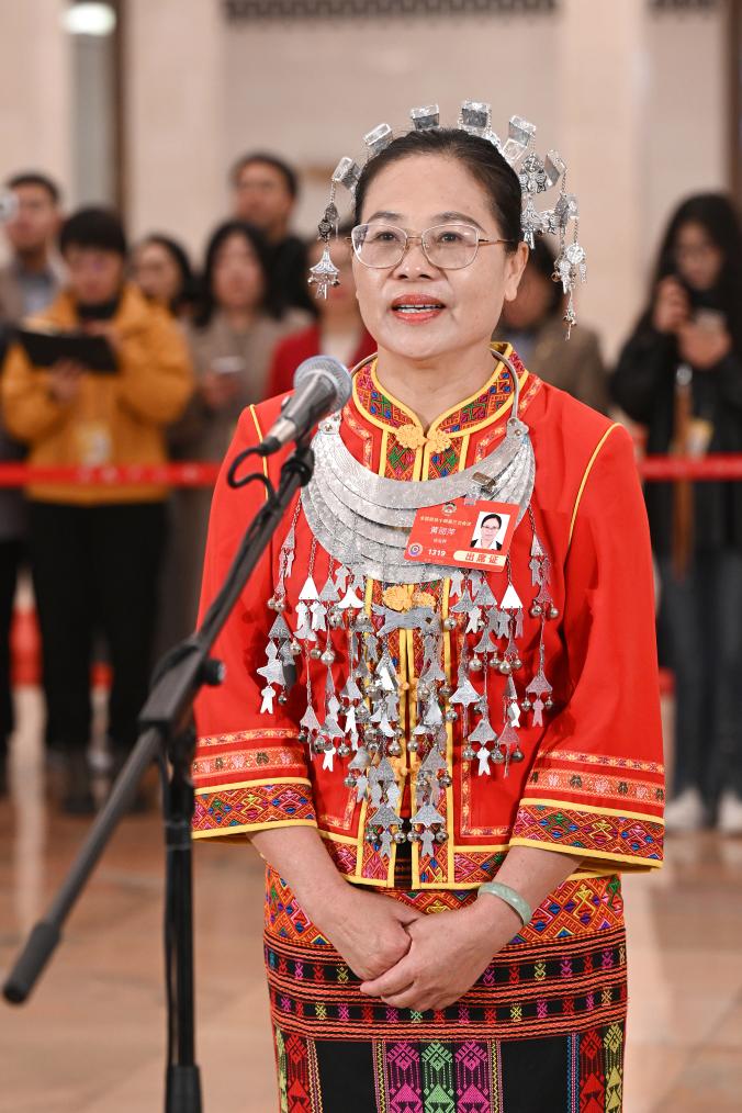 3月10日,全国政协十四届三次会议第三场“委员通道”集体采访活动在北京人民大会堂举行。这是全国政协委员白玛玉珍接受媒体采访。
