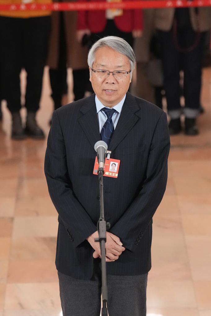 3月10日,全国政协十四届三次会议第三场“委员通道”集体采访活动在北京人民大会堂举行。这是全国政协委员陈星灿接受媒体采访。