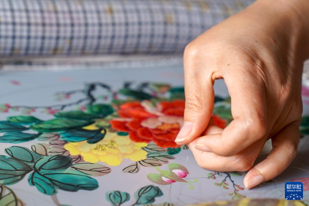 6月6日,在东台嘉丽发绣厂,东台发绣传承人陈伯余用颜料勾画样稿。这一环节是发绣的前置,称为“勾绷落样”。