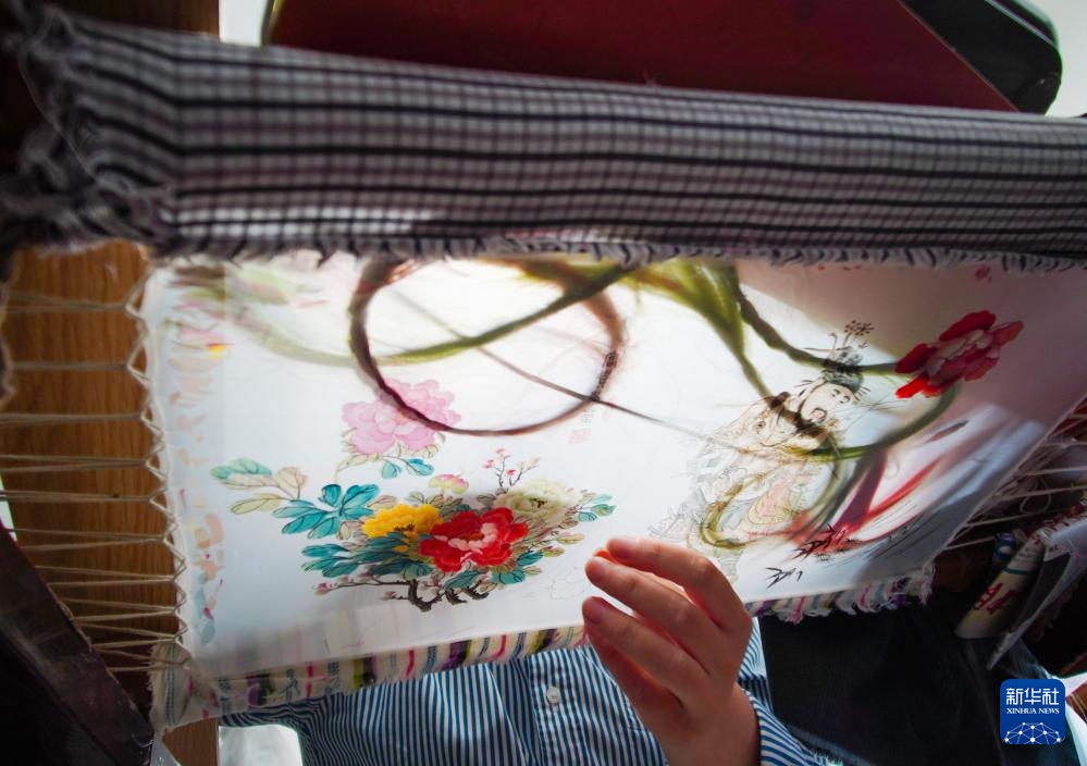 6月6日,在东台嘉丽发绣厂,东台发绣传承人陈伯余指导徒弟装裱一幅双面发绣作品。