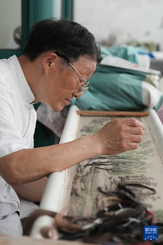 6月6日,在东台嘉丽发绣厂,东台发绣传承人陈伯余绣制客户定制的长卷。