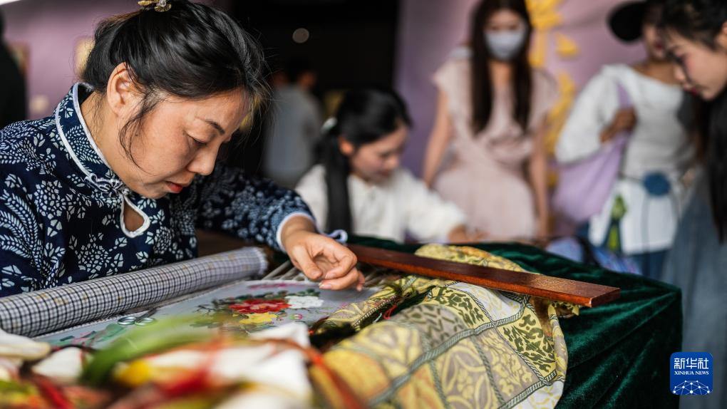 6月6日,在东台西溪天仙缘景区内的东台发绣展示馆,绣娘现场展示绣工。