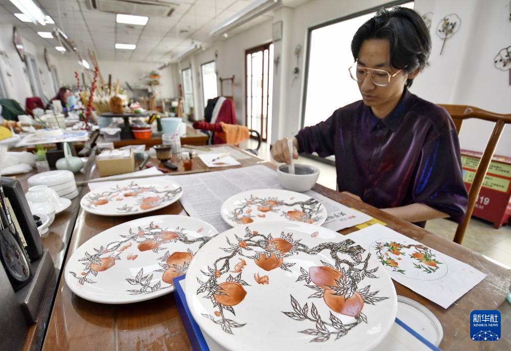 京彩瓷青年传承人在进行创作(6月18日摄)。