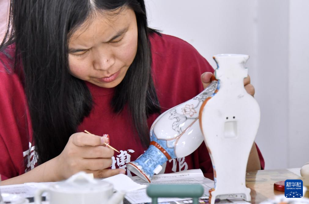 京彩瓷传承人王春艳进行釉上彩绘(6月18日摄)。
