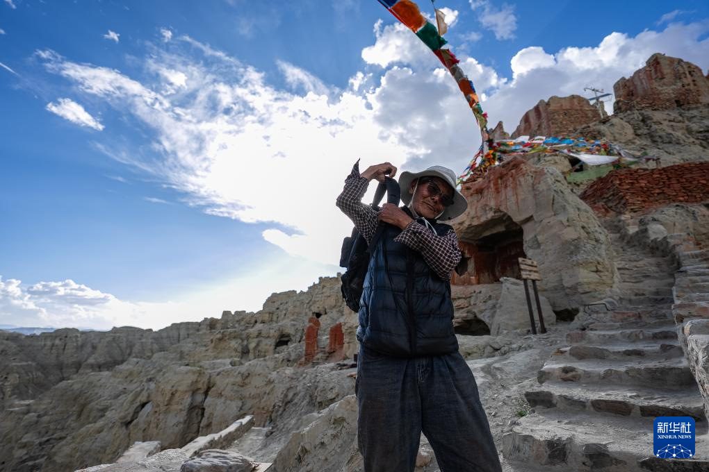 早上十点,仁增旺扎会从家出发,顺着400多级陡峭的台阶,几步一歇地爬上石窟。抵达后,他会先把石窟打扫干净,然后爬上爬下,重点检查几处有壁画的石窟内是否有渗水、坍塌等风险。有游客来参观时,他会给游客讲解石窟及壁画的悠久历史,也会提醒他们要注意保护壁画;送走游客,他总会细心关好每一扇石窟的门。忙碌间隙,他习惯坐在石窟前,喝点自带的酥油茶,嚼几口糌粑——这便是仁增旺扎二十余年如一日的守窟日常。