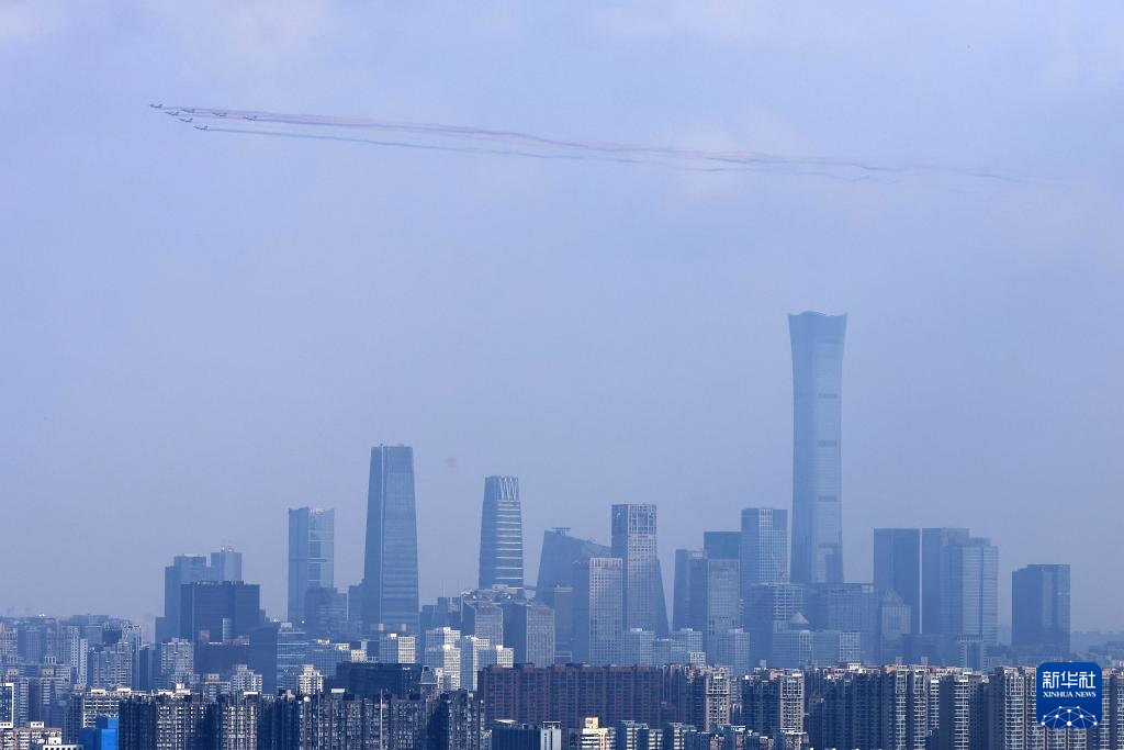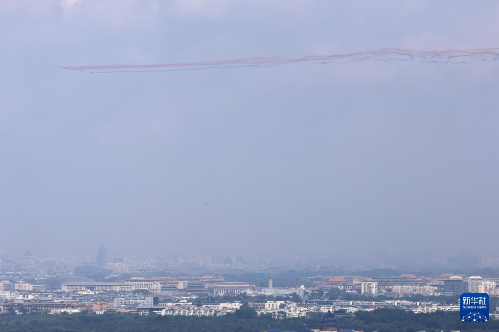 9月3日,纪念中国人民抗日战争暨世界反法西斯战争胜利80周年大会在北京隆重举行。这是空中护旗梯队接受检阅。