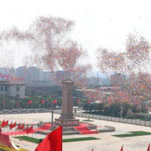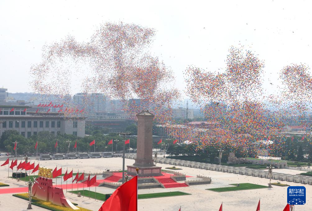 9月3日,纪念中国人民抗日战争暨世界反法西斯战争胜利80周年大会在北京隆重举行。这是纪念大会现场放飞和平鸽和气球。
