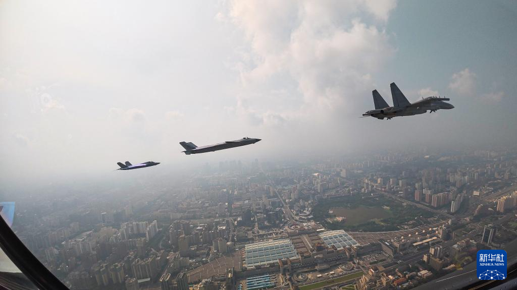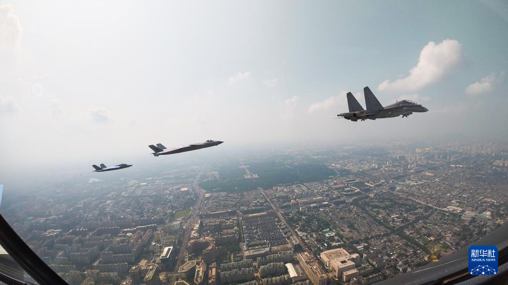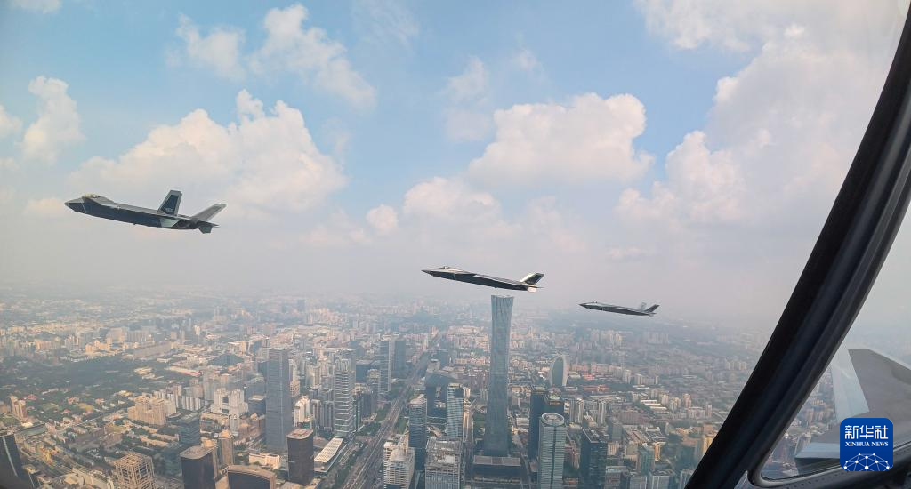9月3日,纪念中国人民抗日战争暨世界反法西斯战争胜利80周年大会在北京隆重举行。这是歼击机梯队从北京城区上空飞过。
