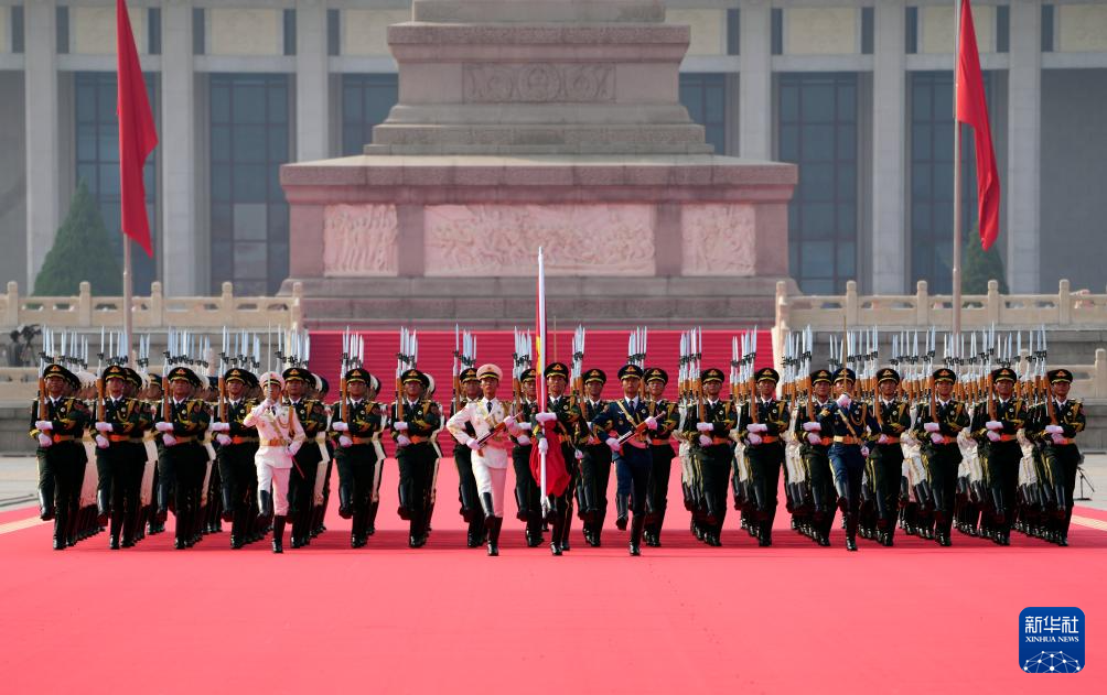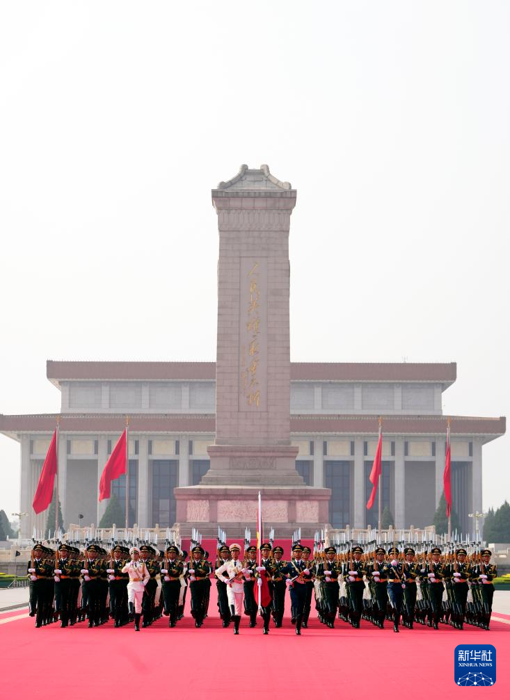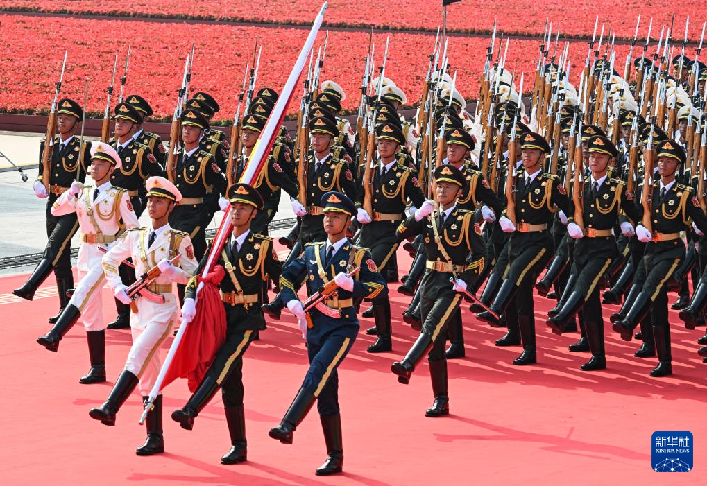 9月3日,纪念中国人民抗日战争暨世界反法西斯战争胜利80周年大会在北京隆重举行。这是国旗护卫队官兵护卫着五星红旗,从人民英雄纪念碑行进至广场北侧升旗区。