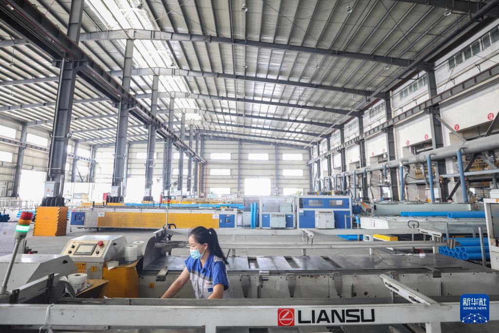 9月4日,海南联塑科技实业有限公司的工作人员在查看生产线运转情况。