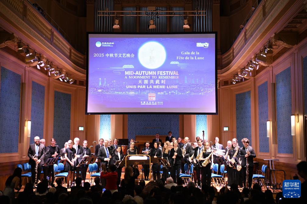 由瑞士伯尔尼中国文化中心主办的2025年“天涯共此时——中秋节”文艺晚会23日晚在日内瓦举行。来自杭州歌剧舞剧院“西子国乐”民乐团和瑞士日内瓦州立管乐团的音乐家们为现场观众献上了一场中西合璧的精彩演出,共同庆祝中华人民共和国成立76周年和中秋佳节。