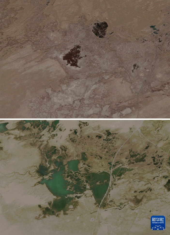 拼版卫星照片:上图为2005年12月卫星拍摄的干涸的台特玛湖及周边区域;下图为2024年8月卫星拍摄的台特玛湖及周边区域。对比可见该地区水域的显著变化。