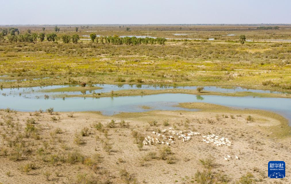 这是9月20日在新疆巴音郭楞蒙古自治州尉犁县喀尔曲尕乡附近的塔里木河流域湿地拍摄的羊群(无人机照片)。