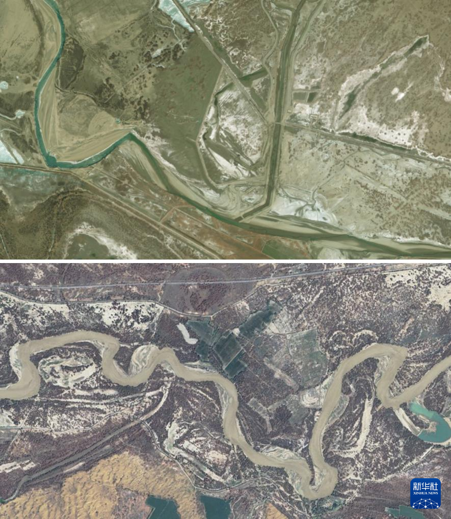 拼版卫星照片:上图为2010年8月14日拍摄的新疆巴音郭楞蒙古自治州尉犁县境内的塔里木河支流乌斯满河和周边地区;下图为2024年8月8日拍摄的新疆巴音郭楞蒙古自治州尉犁县境内的塔里木河支流乌斯满河和周边地区。该地区植被覆盖度和胡杨林地面积显著提升。