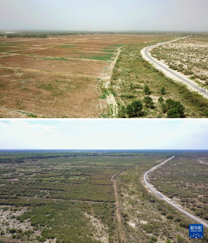 拼版照片:上图为2017年7月24日拍摄的退耕后的塔里木河干流北岸输水堤15公里处的胡杨林保护区(无人机照片);下图为2025年7月拍摄的生态恢复后的同一地点(无人机照片)。该地经生态补水,柽柳、梭梭等天然植被大面积恢复,生长良好。