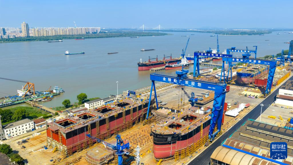 10月14日,在位于江苏省泰州市高港区的泰州三福船舶工程有限公司生产基地,多艘大型船舶正在建造中(无人机照片)。