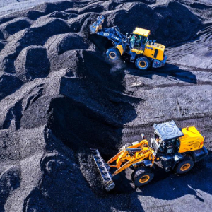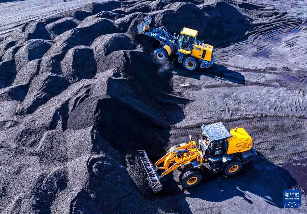 10月19日,在山东省荣成市热电厂一处煤厂,工作人员驾驶铲车进行卸煤、平整煤垛等作业(无人机照片)。
