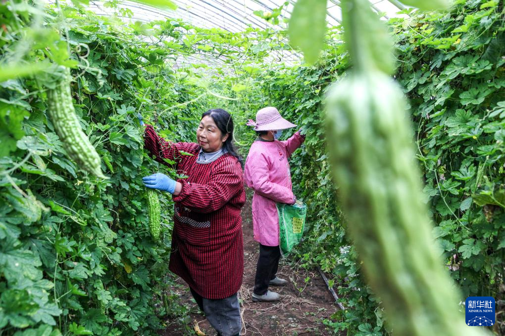10月19日,在河南省焦作市博爱县孝敬镇博爱源蔬菜专业合作社,社员们在采摘苦瓜供应郑州、洛阳等地。