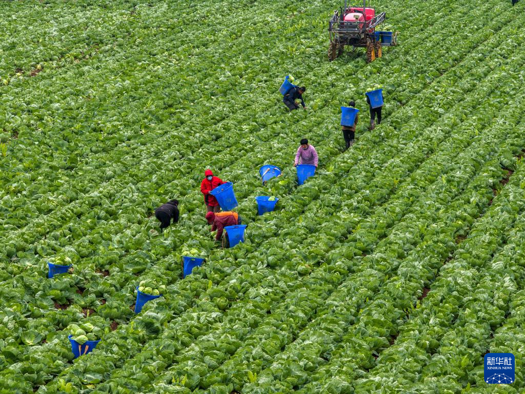 10月19日,在山东省聊城市茌平区振兴街道蔬菜种植基地,农民收获甘蓝,准备供应济南等地(无人机照片)。