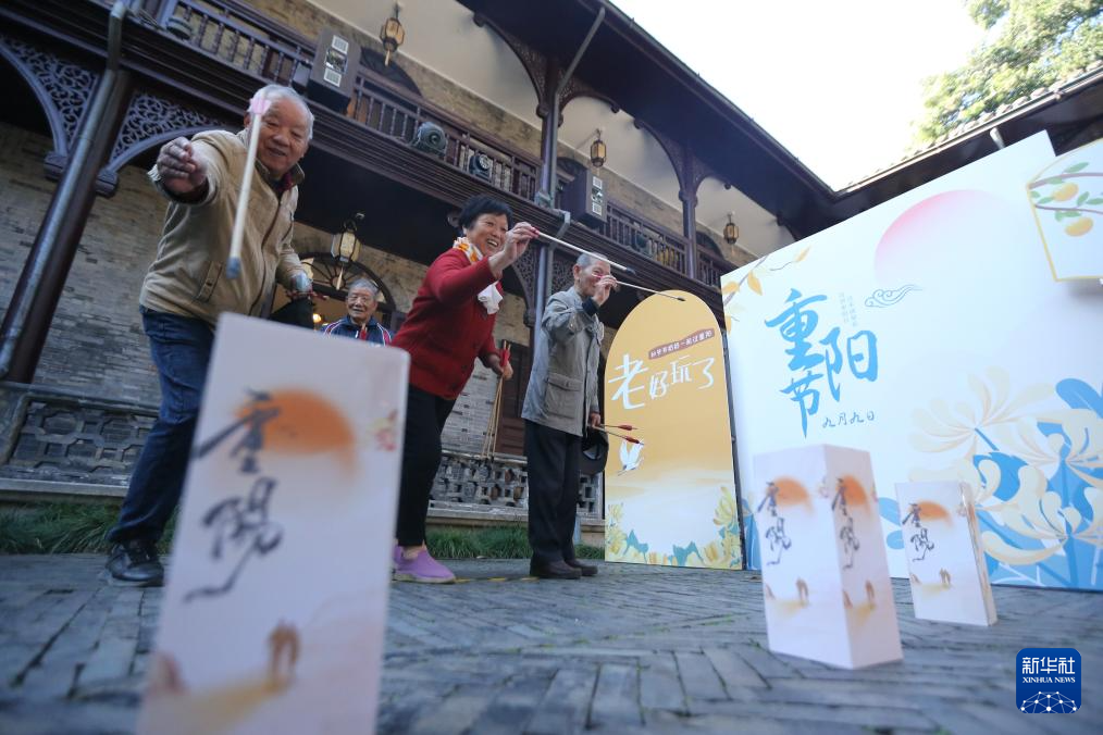 10月29日,在江苏省扬州市何园景区,老年游客们在体验投壶游戏。