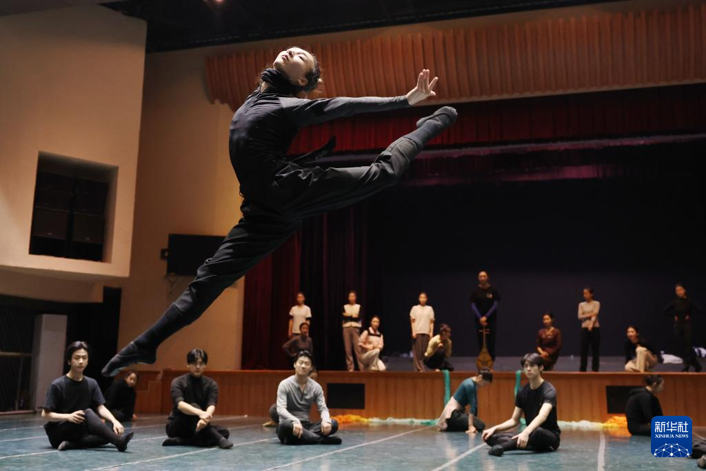新版《丝路花雨》神笔张的扮演者罗志炜(前)在甘肃省歌舞剧院排练厅排练(11月3日摄)。