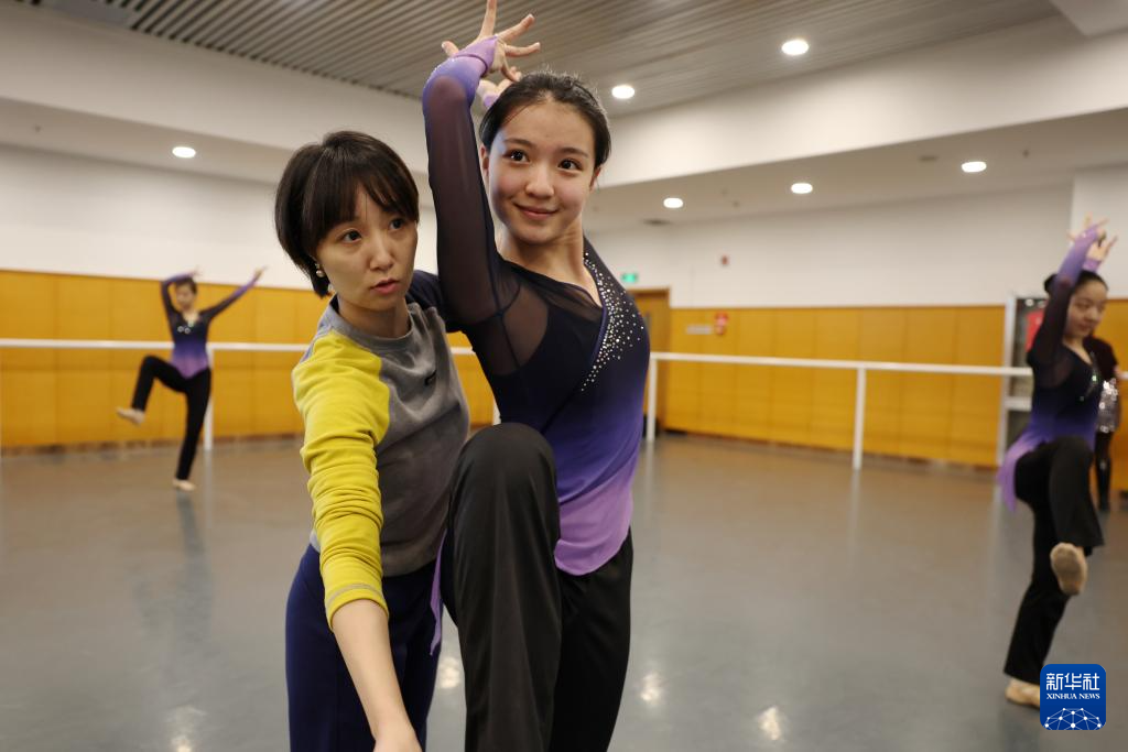 新版《丝路花雨》英娘扮演者康琦(右一)在甘肃省歌舞剧院排练厅排练(11月3日摄)。