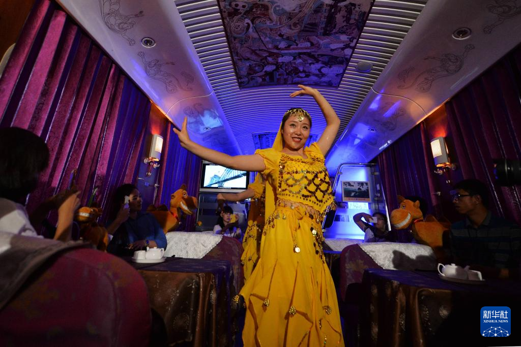 在兰州铁路局首发的“敦煌号”列车上,列车员身穿敦煌元素的服饰为旅客表演敦煌舞(2014年7月10日摄)。