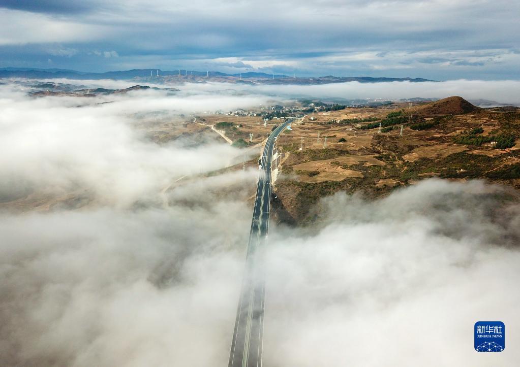 云霧中的貴州省六威高速公路觀風(fēng)海大橋(2018年12月19日攝,無人機(jī)照片)。新華社發(fā)(何歡 攝)