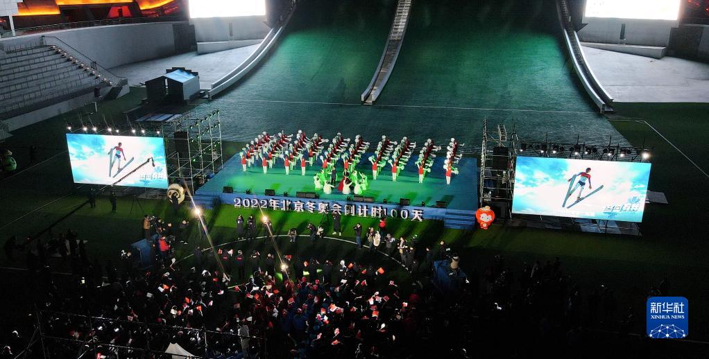 10月26日,“來自崇禮的邀約”——北京2022年冬奧會(huì)倒計(jì)時(shí)100天慶祝活動(dòng)在河北省張家口市崇禮區(qū)國(guó)家跳臺(tái)滑雪中心“雪如意”舉行(無人機(jī)照片)。新華社記者 金皓原 攝