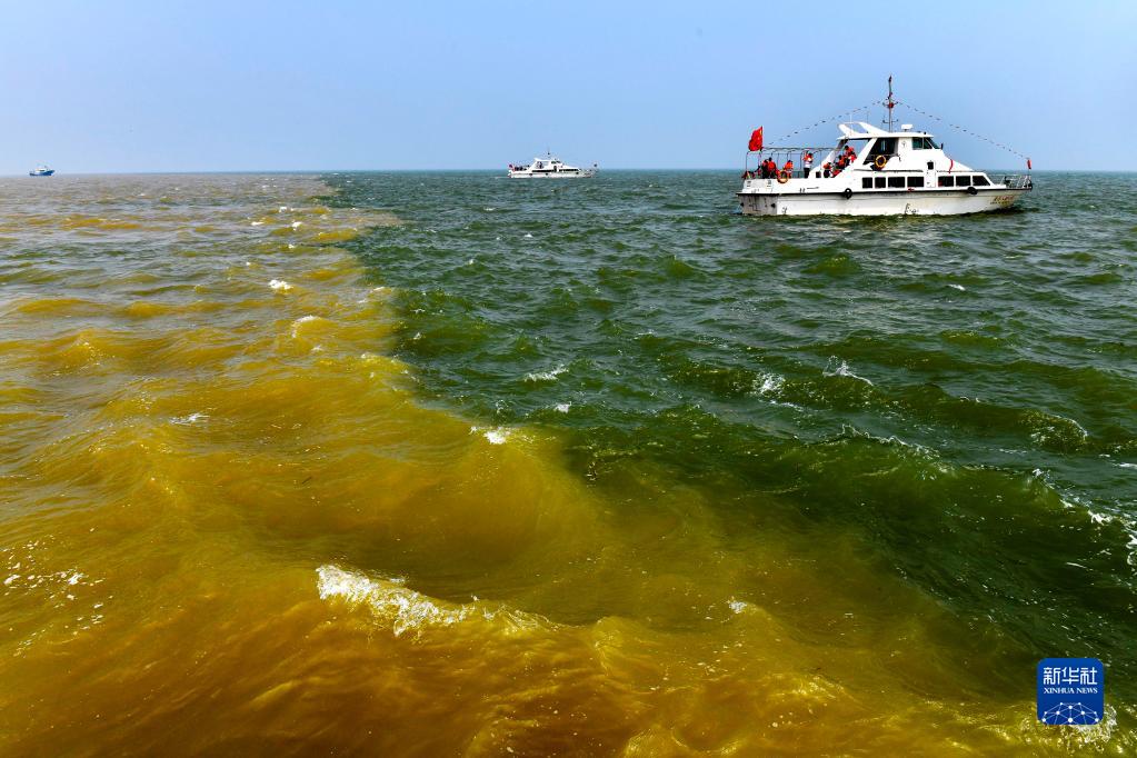 在山東省東營(yíng)市黃河入海口,黃河匯入渤海,形成獨(dú)特景觀(5月13日攝)。新華社記者 郭緒雷攝