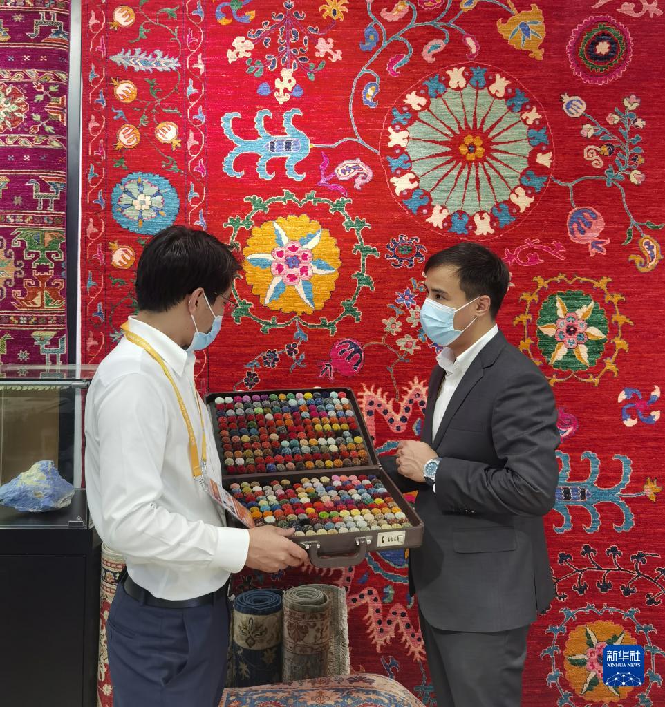 11月5日,阿富汗參展商阿里·法伊茲(右)在第四屆進博會阿富汗手工羊毛地毯展臺忙碌。新華社記者 吳宇 攝