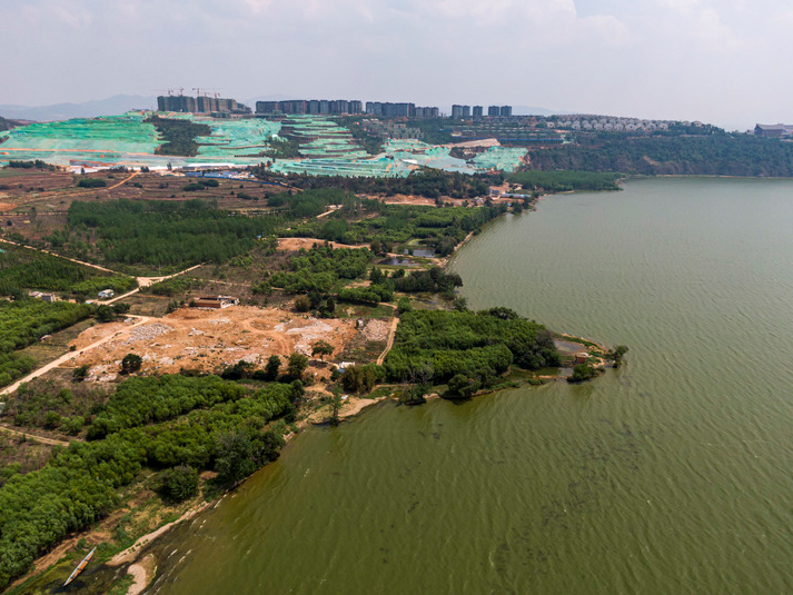 空中遠眺滇池邊的長腰山(2021年4月26日攝 無人機照片)