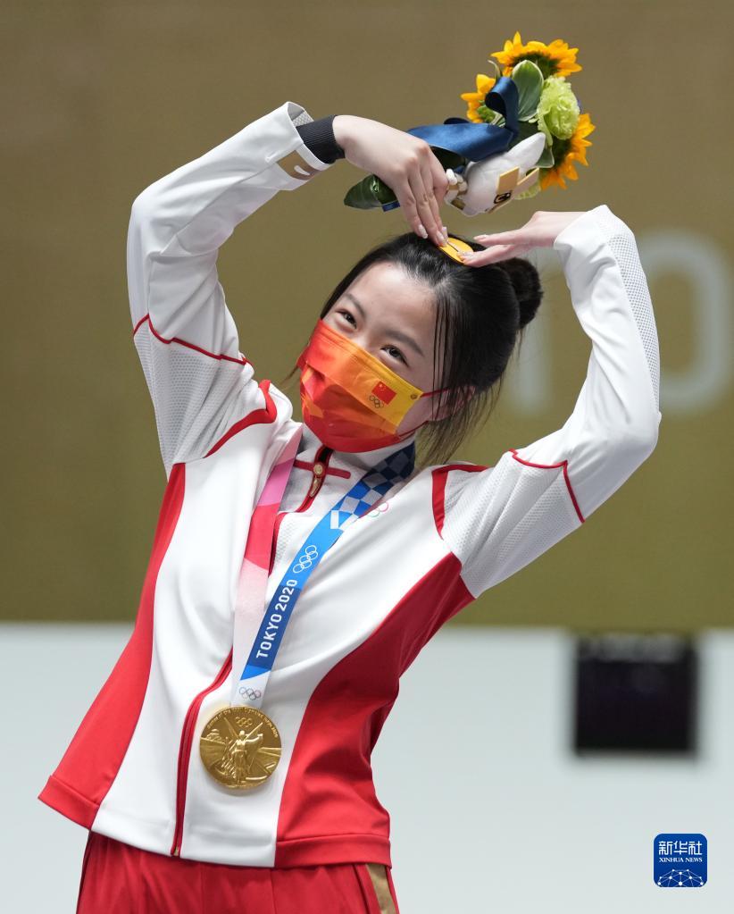 7月24日,楊倩在東京奧運會射擊女子10米氣步槍頒獎儀式上“比心”。新華社記者 鞠煥宗 攝