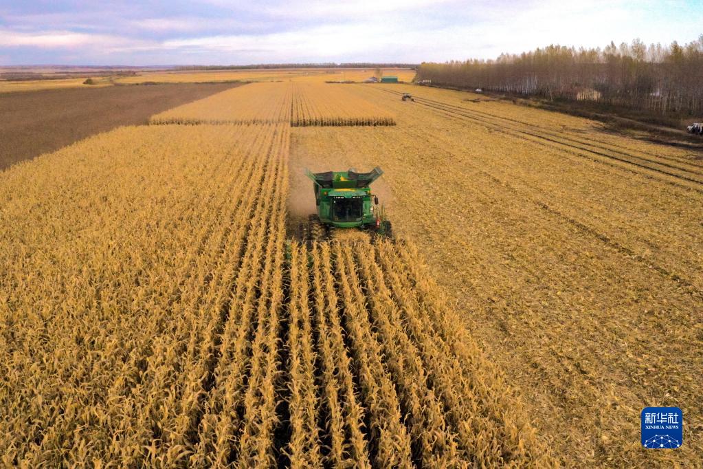 這是10月7日拍攝的黑龍江省綏化市北林區玉米收割現場(無人機照片)。新華社發(楊明輝 攝)