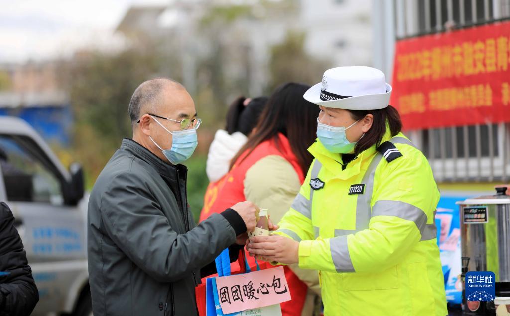 1月17日,在209國道廣西柳州市融安縣段“春運愛心驛站”,交通輔警為司乘人員送姜糖茶。