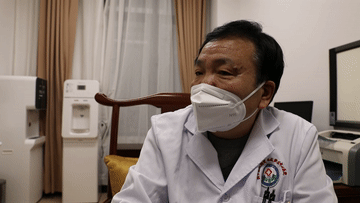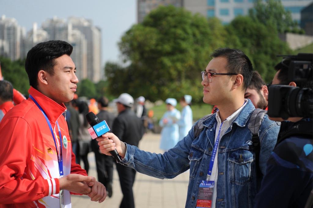 ↑馬文軒(左)在2018年的一場馬拉松賽上擔任醫療志愿者時接受記者采訪。