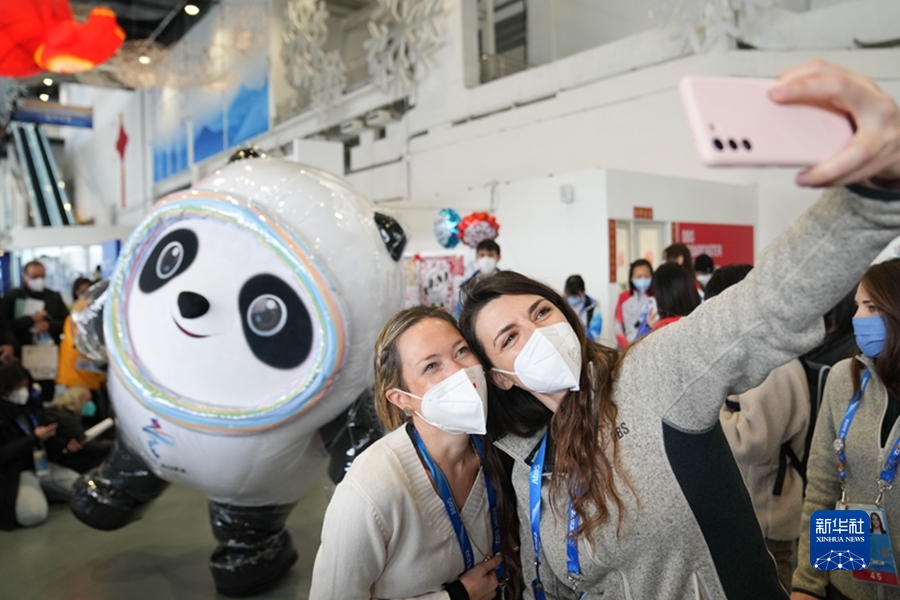 2月12日,北京冬奧會主媒體中心舉辦集體采訪活動,現場觀眾與北京2022年冬奧會吉祥物“冰墩墩”自拍留念。 新華社記者 鞠煥宗 攝
