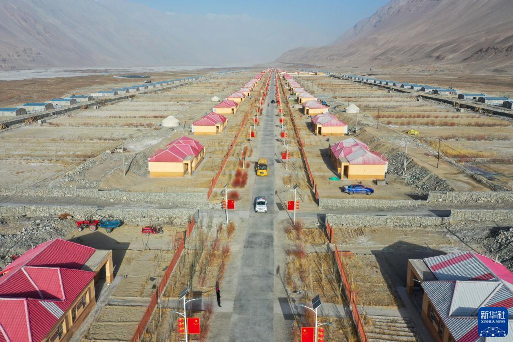 在新疆塔什庫爾干塔吉克自治縣達布達爾鄉熱斯喀木村,校車帶著返校學生向縣城的學校出發(2月25日攝,無人機照片)。新華社記者 丁磊 攝