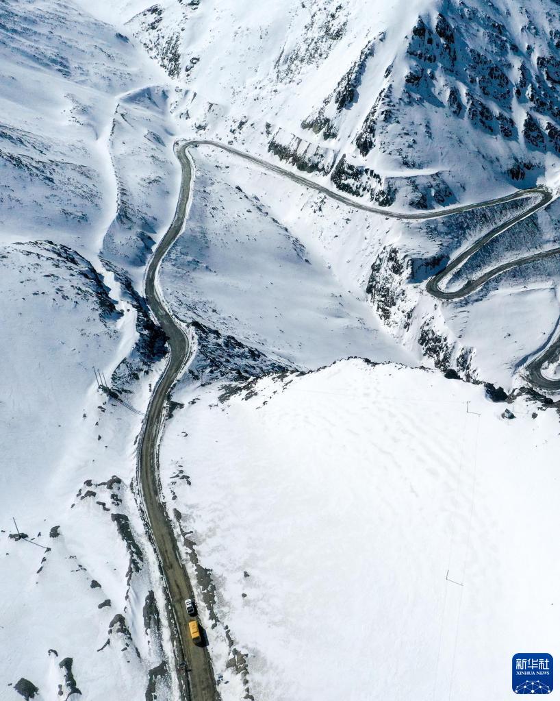 返校學生乘坐的校車翻越蓋家克達坂(2月25日攝,無人機照片)。新華社記者 丁磊 攝