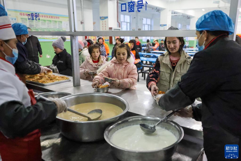 在新疆塔什庫爾干塔吉克自治縣城鄉寄宿制小學,學生在食堂領取免費早餐(2月26日攝)。新華社記者 丁磊 攝