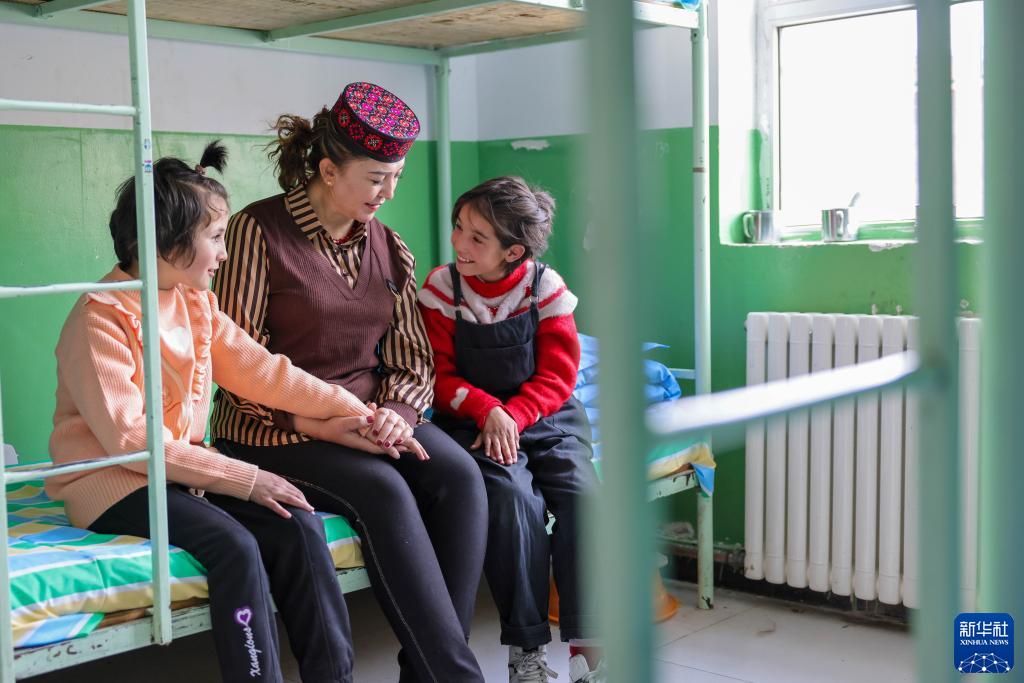 在新疆塔什庫爾干塔吉克自治縣城鄉寄宿制小學,返校的學生在宿舍和生活老師聊天(2月25日攝)。新華社記者 丁磊 攝