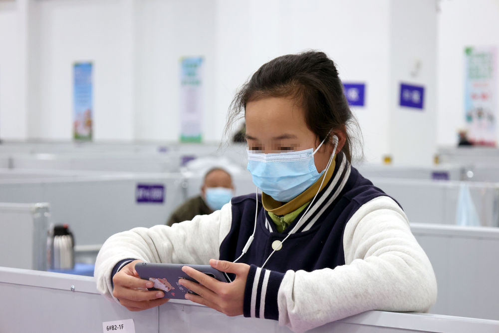 ↑4月19日,上海臨港方艙醫院,一名學生感染者通過手機上網課。