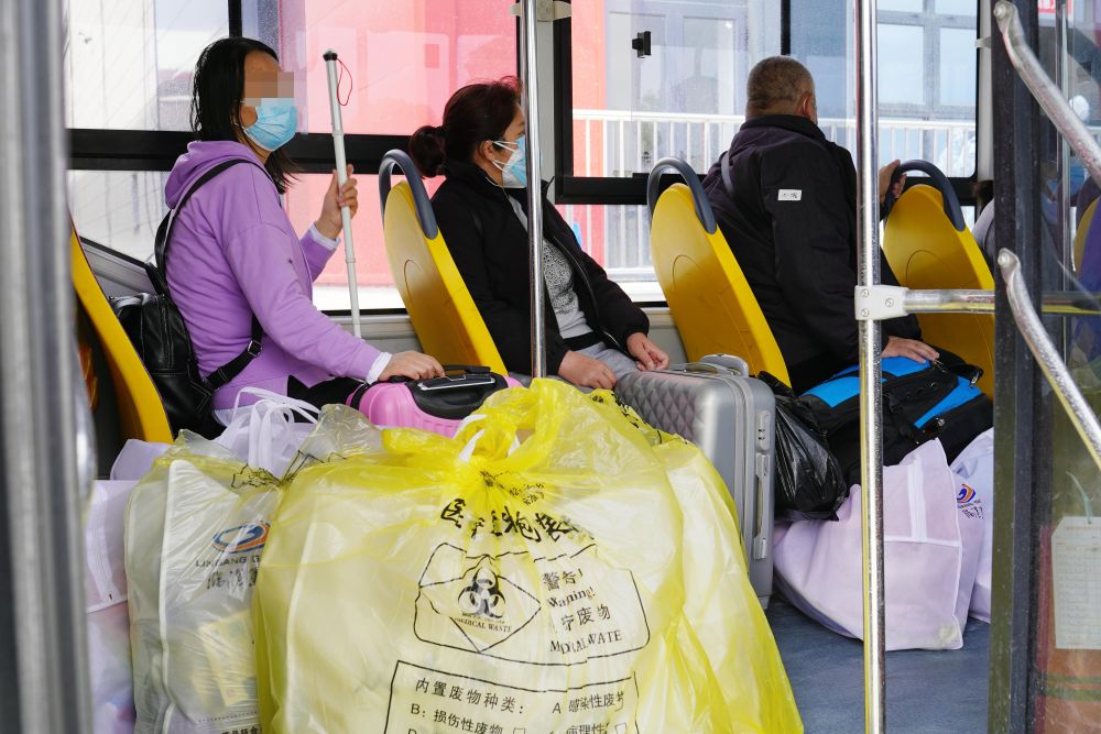 ↑4月30日,康復出艙人員離開上海臨港方艙醫院,乘坐轉運車輛返回居住地接受健康監測。