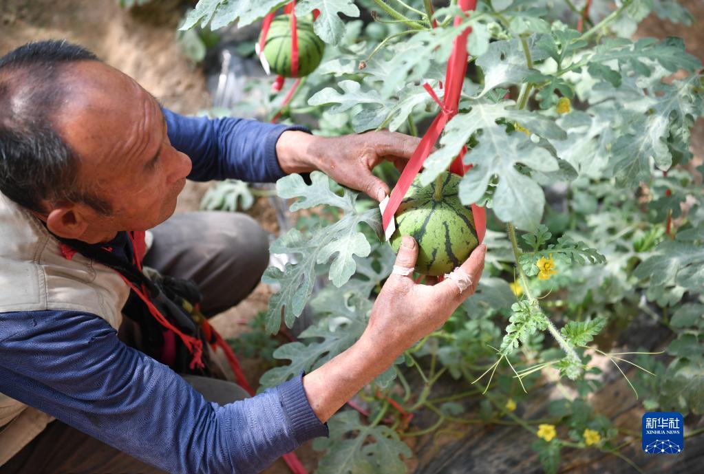 西瓜被紅繩兜住“掛”在藤上,每個都有“生日卡”,記錄著授粉日期和預計上市時間?!暗趼鞴贤L透光,生長期短、產量大。單棚一年能掙六七萬元。”本村瓜農姬小軍有本生意經:“這批瓜趕在大田西瓜之前上市,能賣個好價錢!”