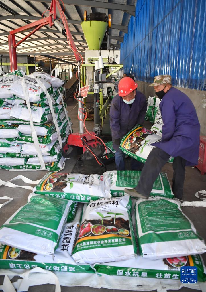在延安市延長縣現代循環(huán)農業(yè)示范園一家企業(yè)車間內,工人在搬運有機肥料(4月1日攝)。新華社記者 邵瑞 攝