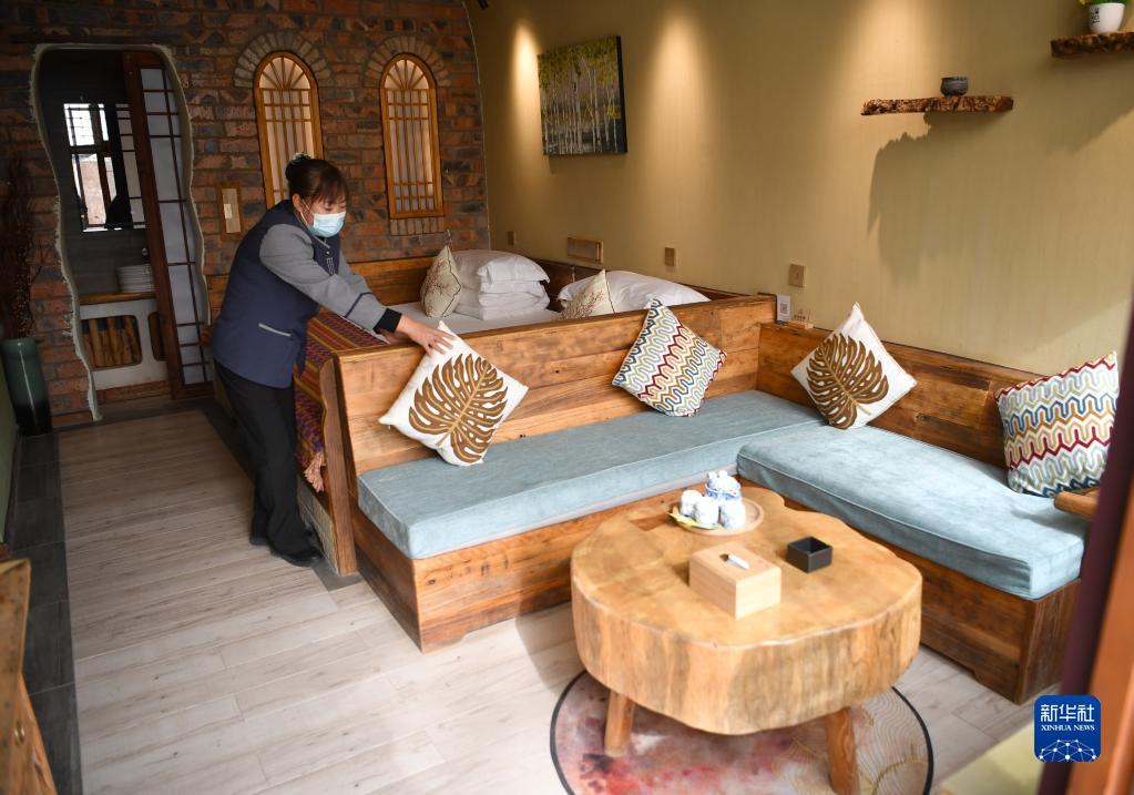 服務員在延安市寶塔區(qū)河莊坪鎮(zhèn)趙家岸村一家民宿內整理房間(3月30日攝)。新華社記者 邵瑞 攝