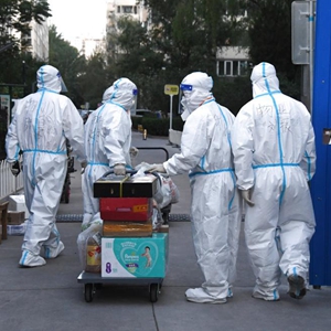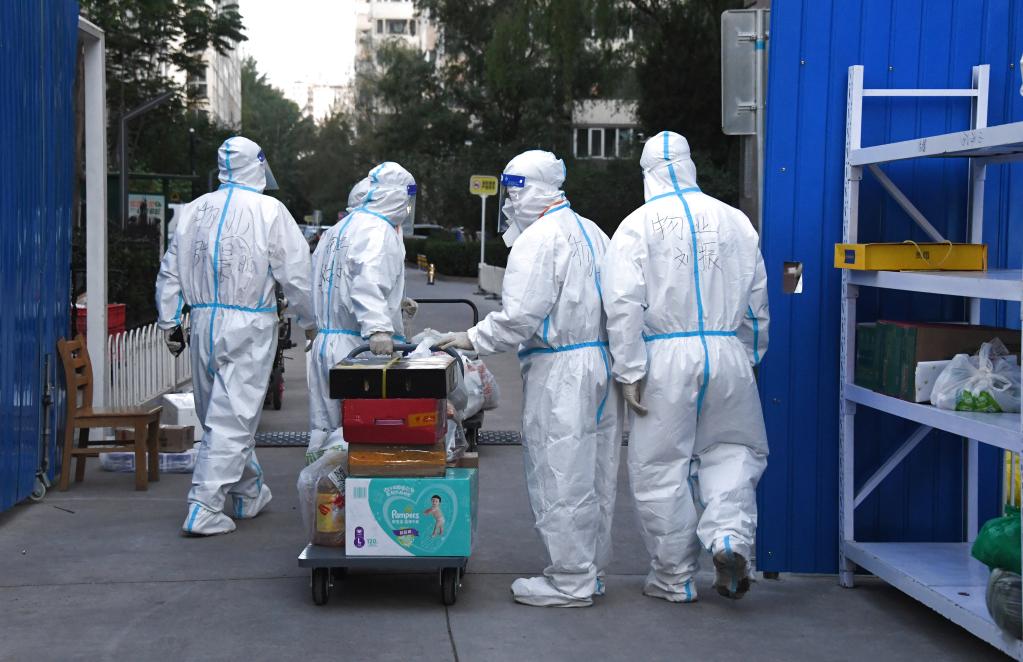 5月15日,在北京市海淀區(qū)中關村街道三才堂水清木華園小區(qū)設置的緩沖區(qū),工作人員準備為小區(qū)居民運送訂購的物資。(新華社記者任超 攝)
